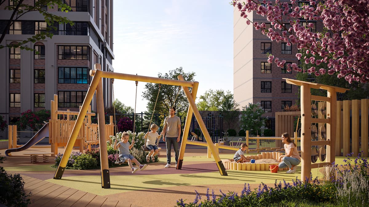Двор-трансформер «Увлечений» — это динамичная актив‑зона для всех. Здесь есть профессиональные спортивные площадки, зона воркаута, вертикальный лабиринт и интерактивные головоломки для детей, а также уютные уголки для спокойного отдыха.