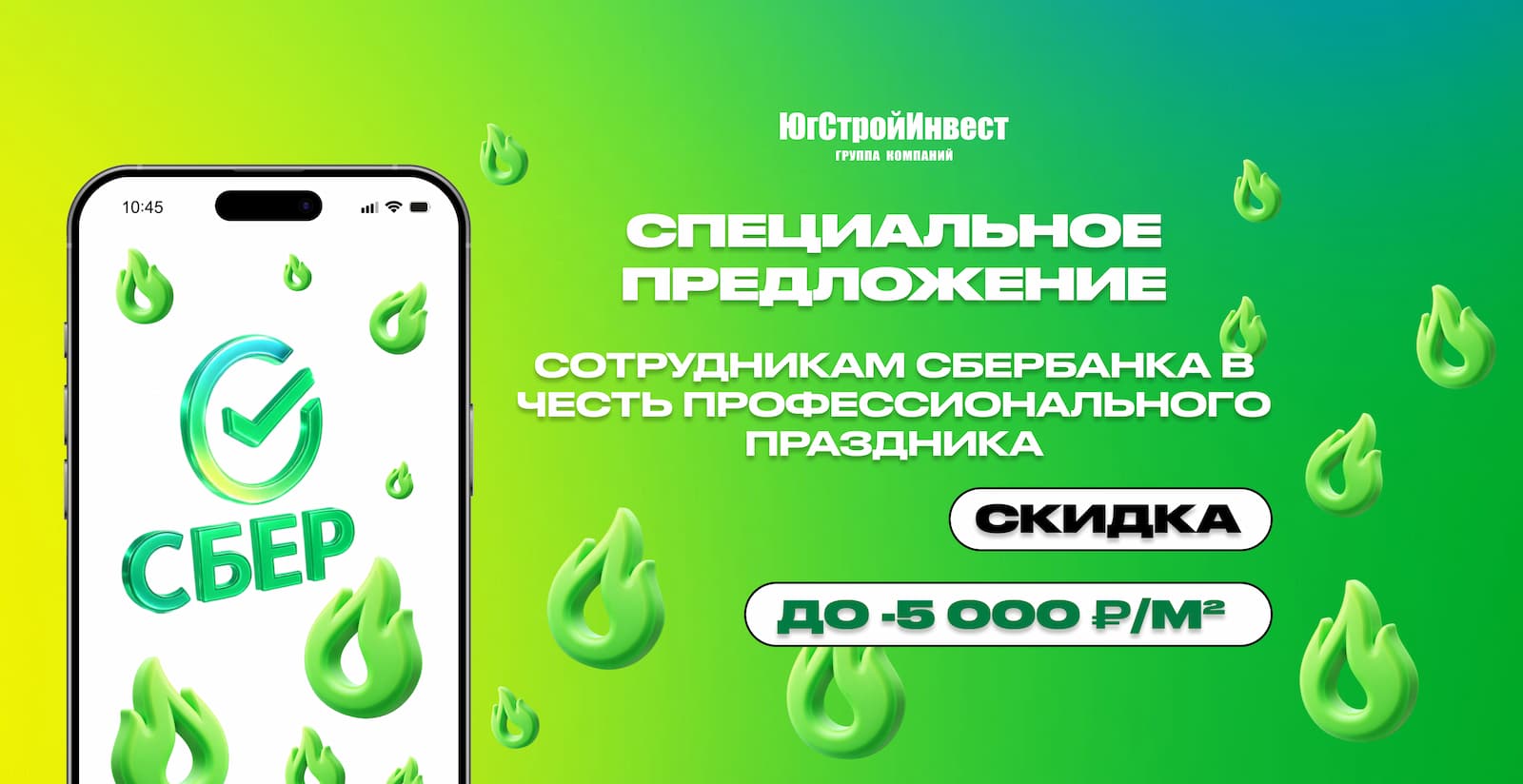 В честь Дня сотрудника Сбербанка России ГК «ЮгСтройИнвест» запускает специальное предложение. В период времени с 12.11 до 30.11.2025 сотрудникам Сбербанка, которые приобретают квартиру от «ЮгСтройИнвест» доступны корпоративные скидки: скидка до 5000 / кв.м. всем сотрудникам Сбербанка России при покупке квартиры от ГК ЮгСтройИнвест С 12 до 30 ноября 2025 г. и скидка до 4000 / кв.м сотрудникам Сбербанка при оформлении покупки квартиры в ипотеку с 12 до 30.11.2025