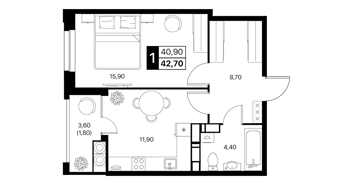 1-комнатная квартира: 42,7 м²