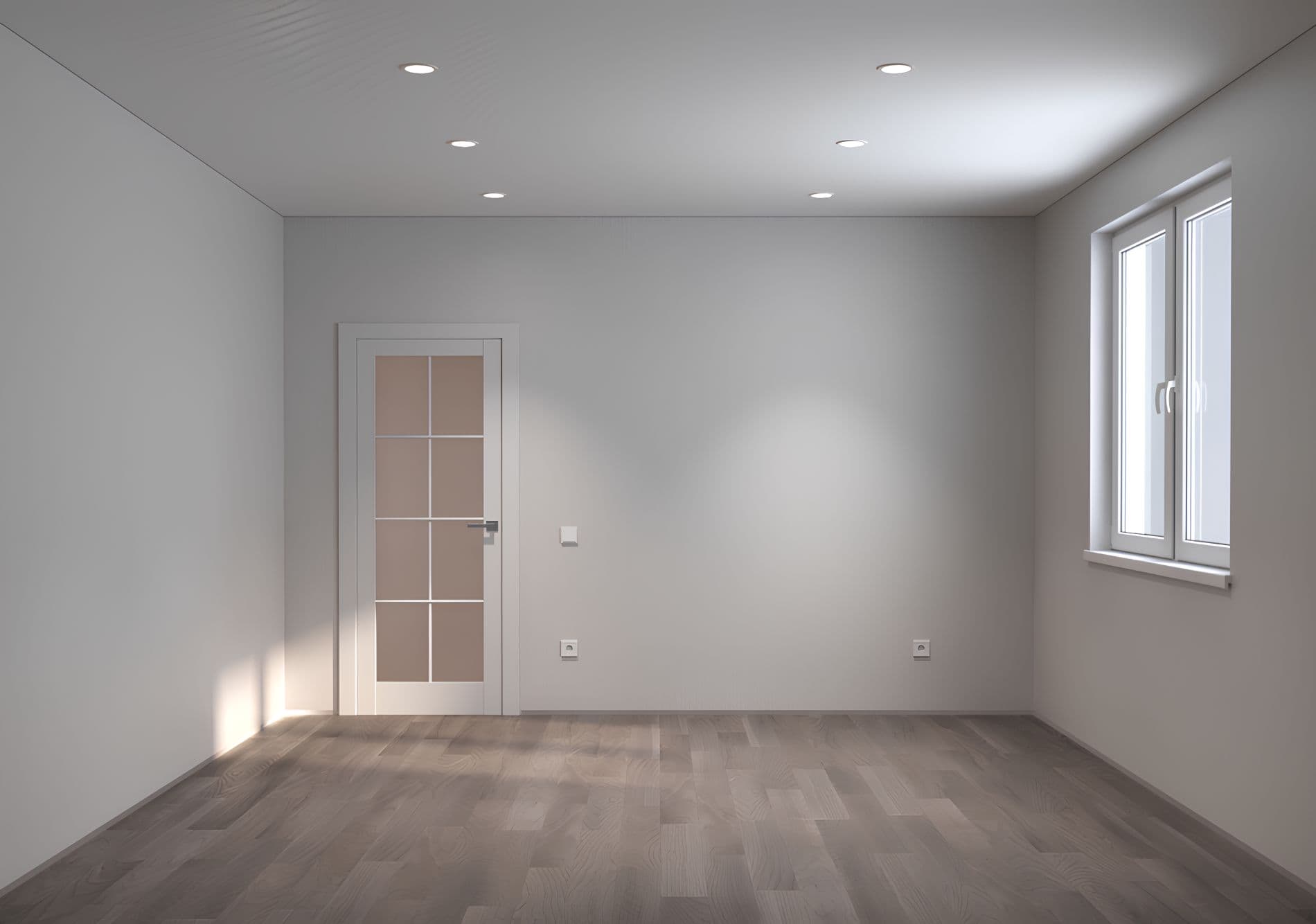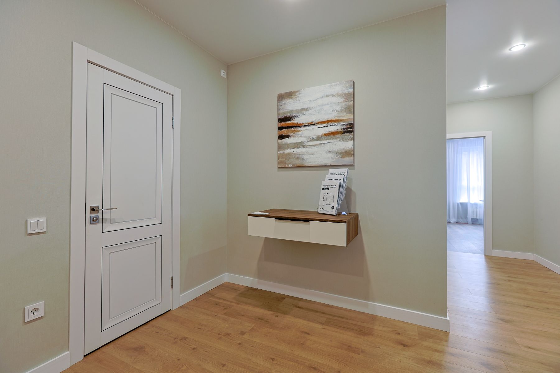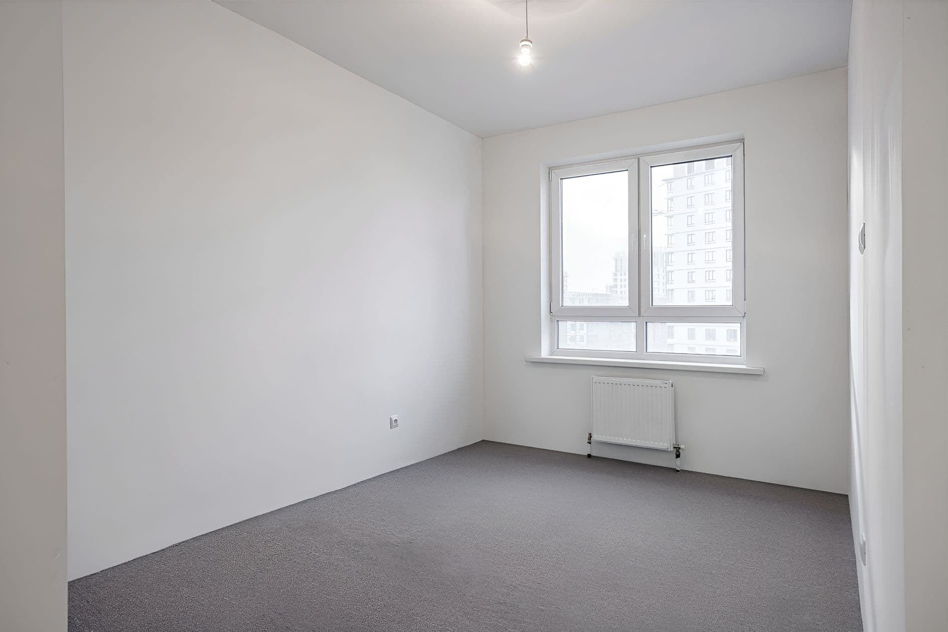 Чистый лист для вашего дизайна. Потолки покрашены, стены выровнены под обои, на полу аккуратный ковролин; электрика разведена, установлен базовый свет. Санузел собран (ванна, унитаз, раковина) — въезжайте и доводите интерьер без пыли и черновых работ.
