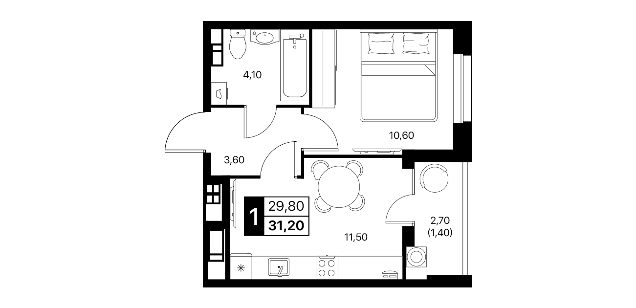 1-комнатная квартира: 31,2 м²