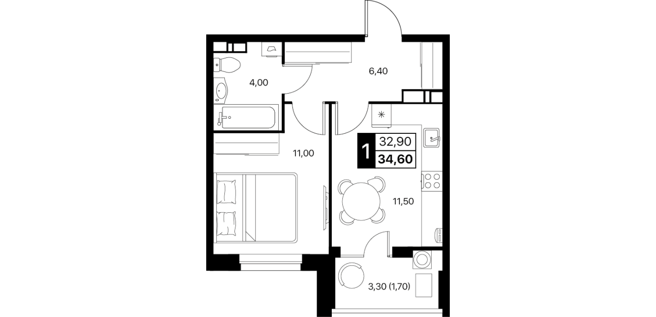 1-комнатная квартира: 34,6 м²
