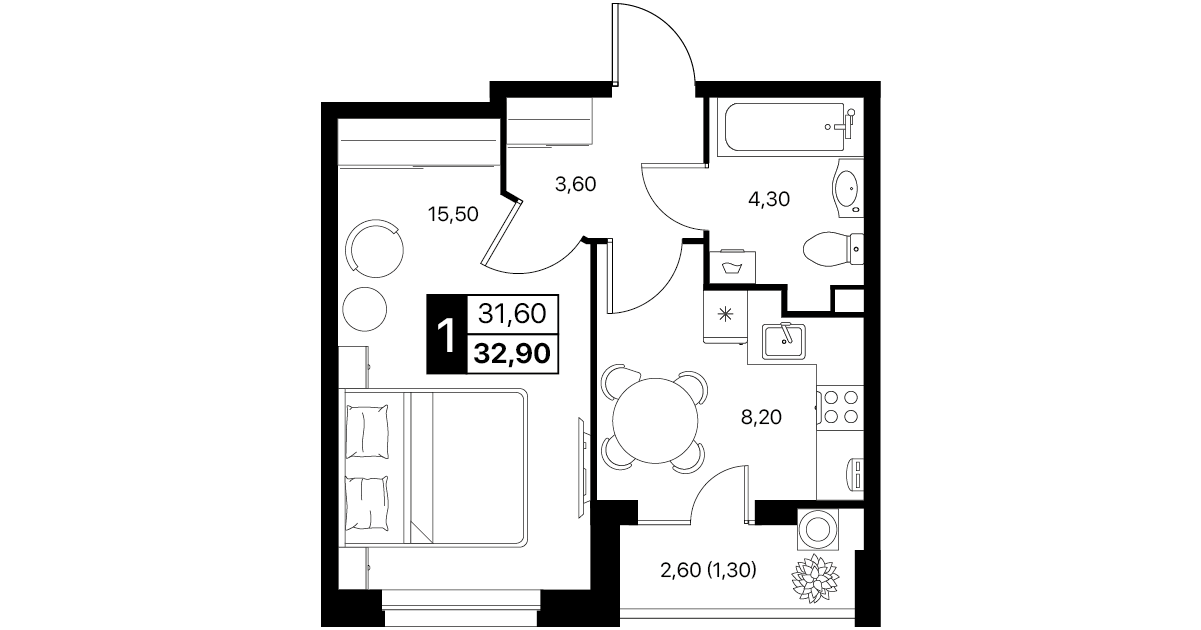 1-комнатная квартира: 32,9 м²