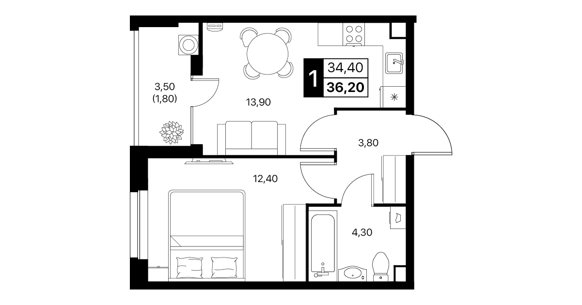 1-комнатная квартира: 36,2 м²