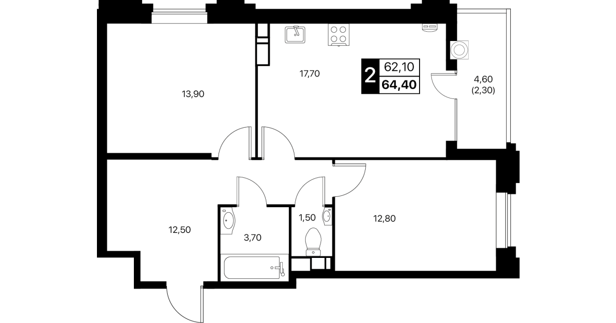 2-комнатная квартира: 64,4 м²