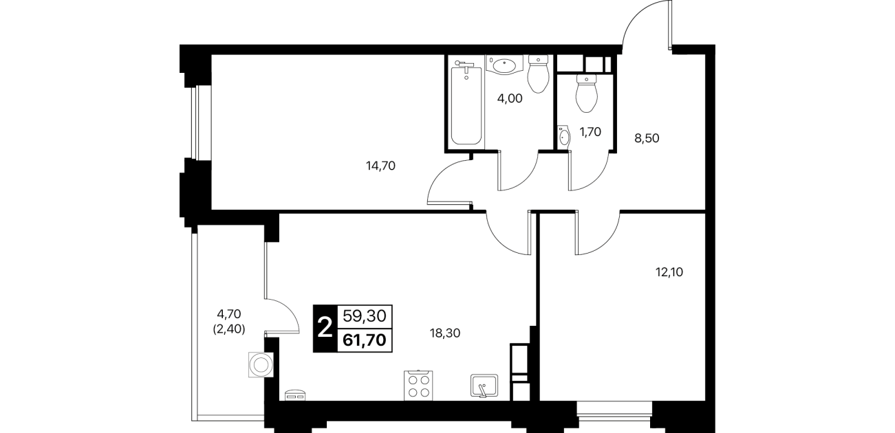 2-комнатная квартира: 61,7 м²