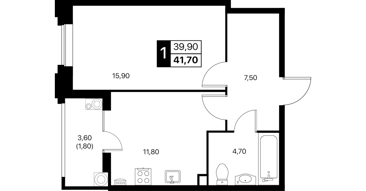 1-комнатная квартира: 41,7 м²
