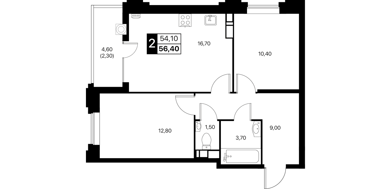2-комнатная квартира: 56,4 м²