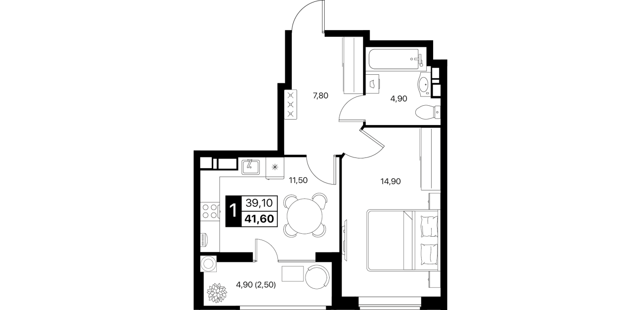 1-комнатная квартира: 41,6 м²