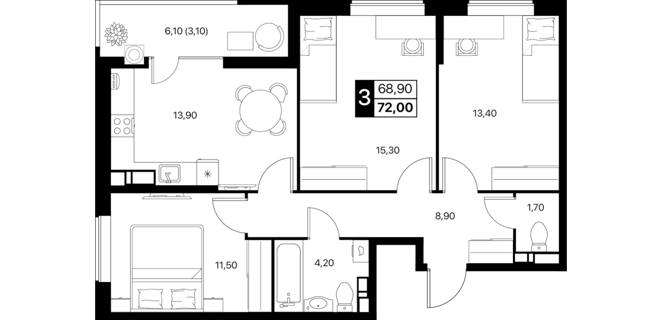 3-комнатная квартира: 72 м²