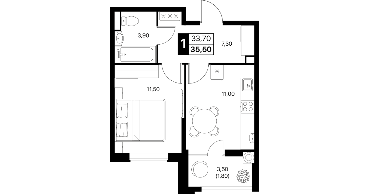 1-комнатная квартира: 35,5 м²