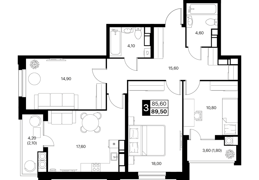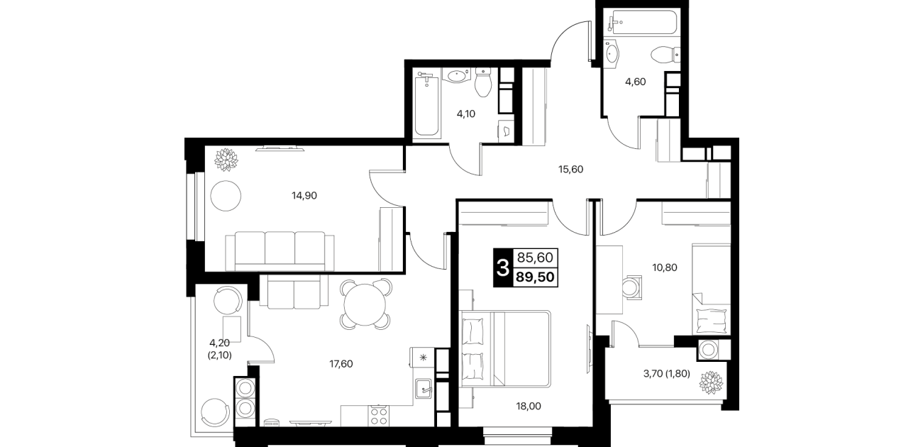 Чистый лист для вашего дизайна. Потолки покрашены, стены выровнены под обои, на полу аккуратный ковролин; электрика разведена, установлен базовый свет. Санузел собран (ванна, унитаз, раковина) — въезжайте и доводите интерьер без пыли и черновых работ.