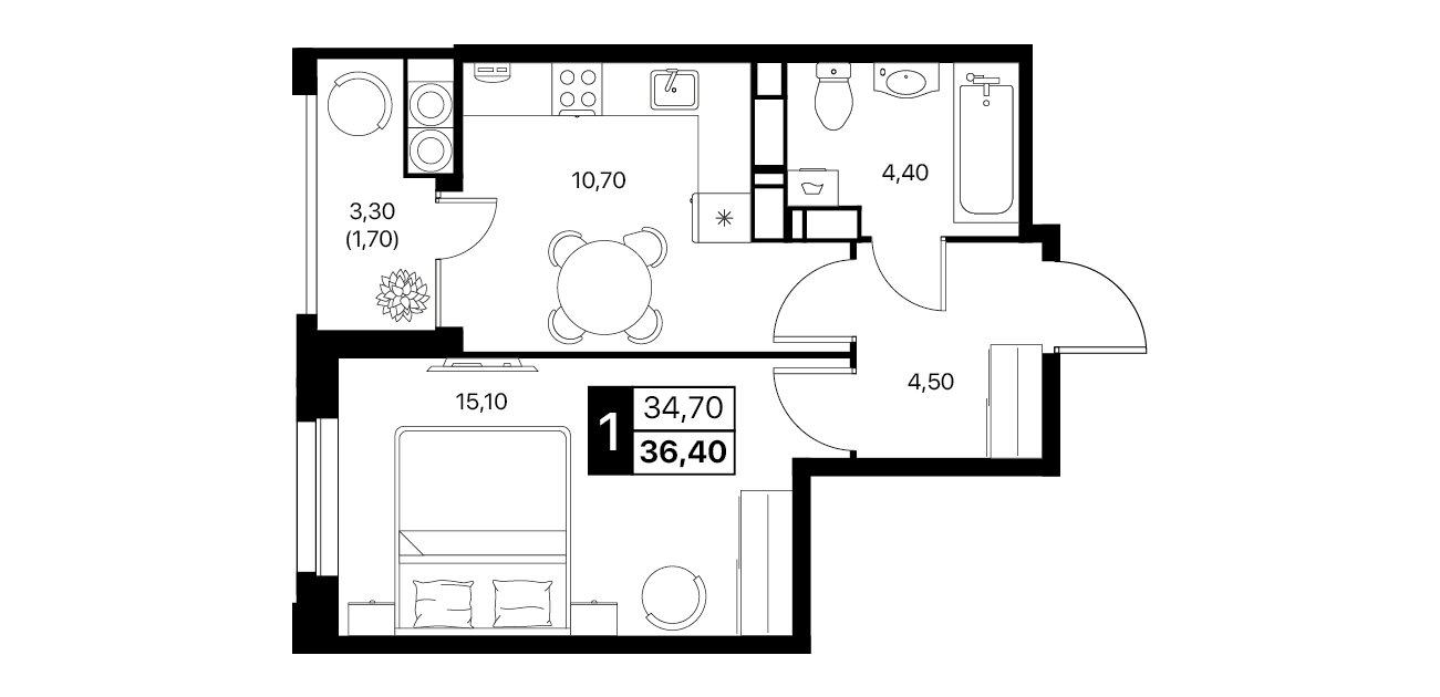 1-комнатная квартира: 36,4 м²