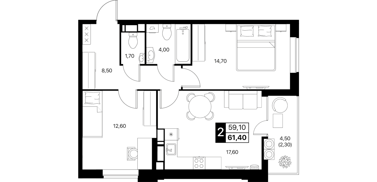 Повышенный класс отделки в двух палитрах — Light и Dark. Ниши под скрытый карниз, ламинат 33-го класса, двери с покрытием soft touch, розетки и выключатели. В санузле — плитка Kerama Marazzi, керамогранит «терраццо», инсталляция, тропический душ и зеркало с LED; балкон отделан и со светом.