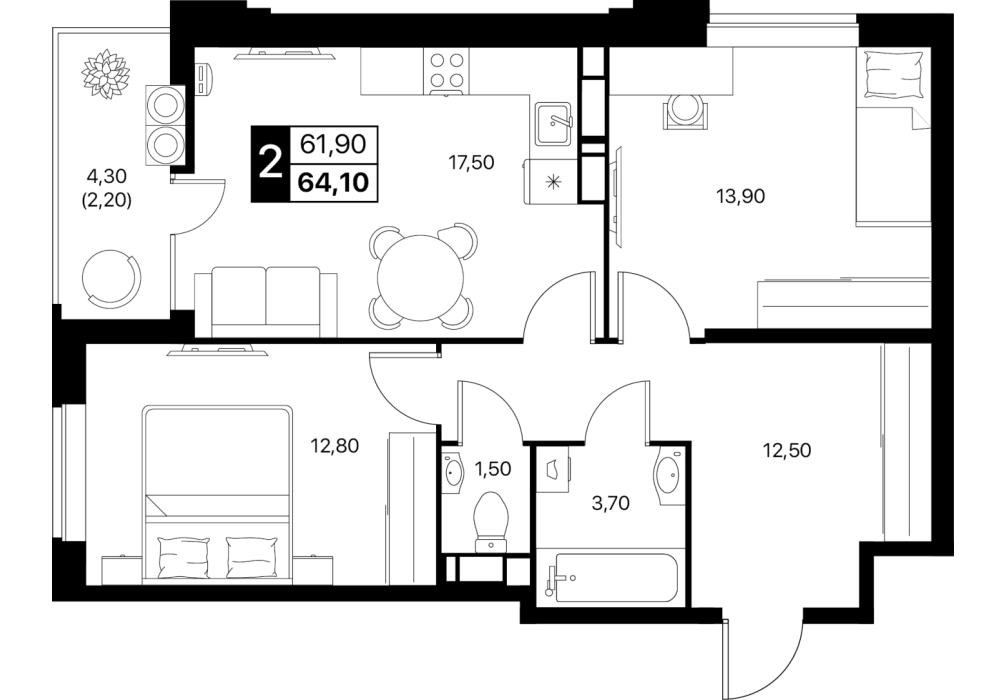 Чистый лист для вашего дизайна. Потолки покрашены, стены выровнены под обои, на полу аккуратный ковролин; электрика разведена, установлен базовый свет. Санузел собран (ванна, унитаз, раковина) — въезжайте и доводите интерьер без пыли и черновых работ.