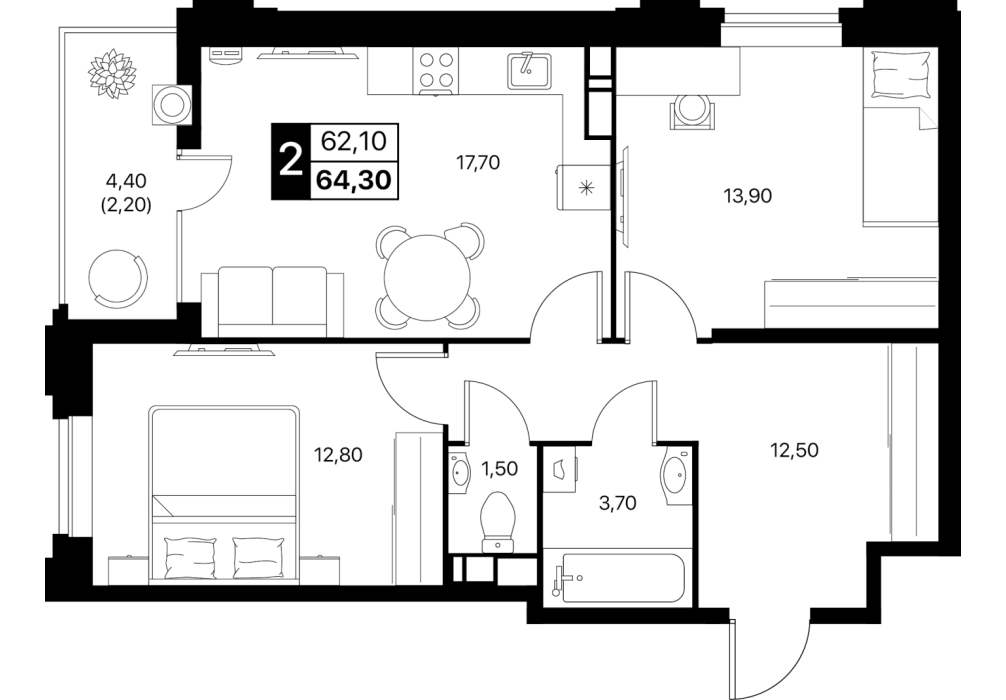 Чистый лист для вашего дизайна. Потолки покрашены, стены выровнены под обои, на полу аккуратный ковролин; электрика разведена, установлен базовый свет. Санузел собран (ванна, унитаз, раковина) — въезжайте и доводите интерьер без пыли и черновых работ.