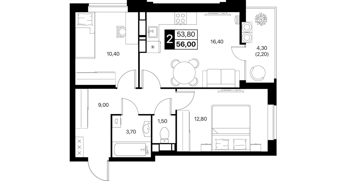В пакет входит кухня, тюль, корпусная и мягкая мебель, сплит-системы и вся необходимая бытовая техника.