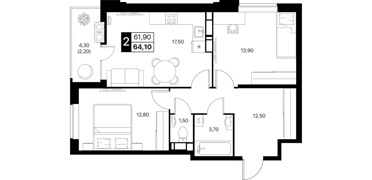 Повышенный класс отделки в двух палитрах — Light и Dark. Ниши под скрытый карниз, ламинат 33-го класса, двери с покрытием soft touch, розетки и выключатели. В санузле — плитка Kerama Marazzi, керамогранит «терраццо», инсталляция, тропический душ и зеркало с LED; балкон отделан и со светом.