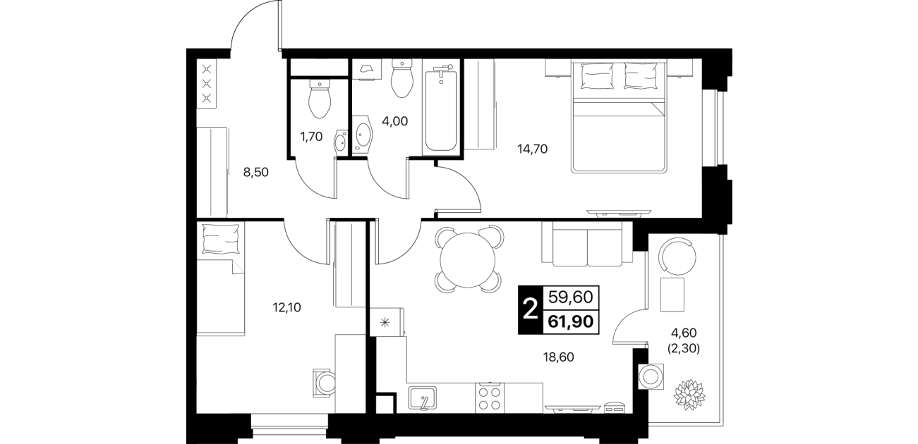 Повышенный класс отделки в двух палитрах — Light и Dark. Ниши под скрытый карниз, ламинат 33-го класса, двери с покрытием soft touch, розетки и выключатели. В санузле — плитка Kerama Marazzi, керамогранит «терраццо», инсталляция, тропический душ и зеркало с LED; балкон отделан и со светом.