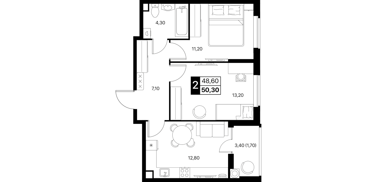 Чистый лист для вашего дизайна. Потолки покрашены, стены выровнены под обои, на полу аккуратный ковролин; электрика разведена, установлен базовый свет. Санузел собран (ванна, унитаз, раковина) — въезжайте и доводите интерьер без пыли и черновых работ.