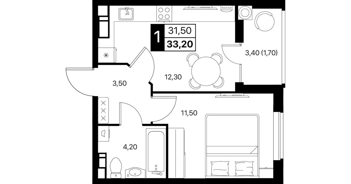 1-комнатная квартира: 33,2 м²