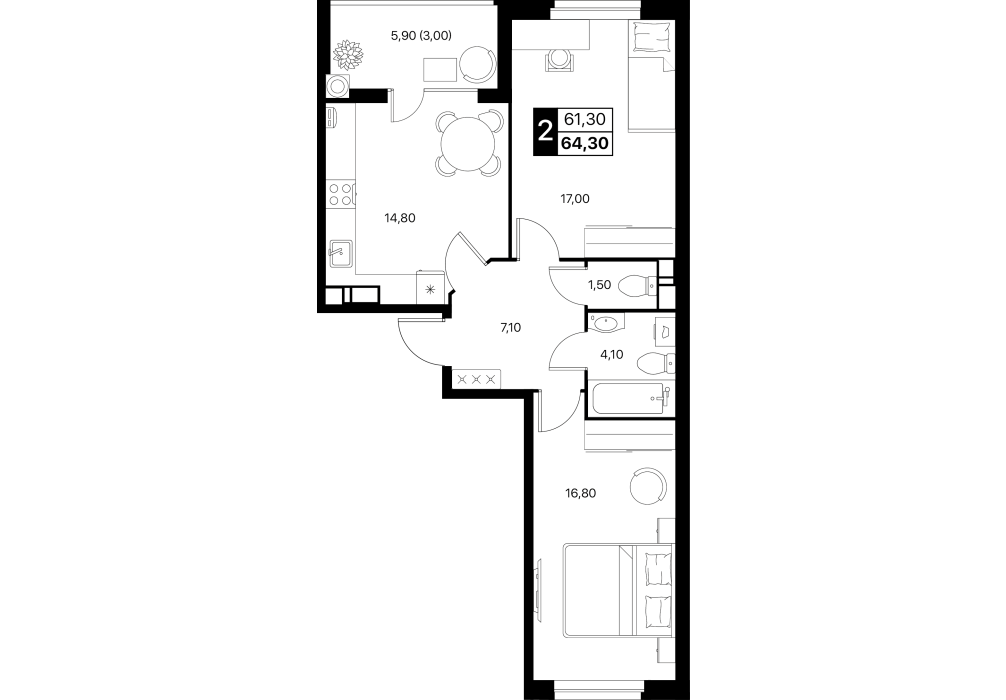 Чистый лист для вашего дизайна. Потолки покрашены, стены выровнены под обои, на полу аккуратный ковролин; электрика разведена, установлен базовый свет. Санузел собран (ванна, унитаз, раковина) — въезжайте и доводите интерьер без пыли и черновых работ.