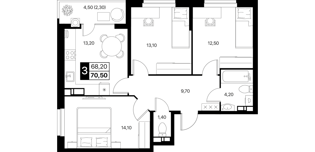 3-комнатная квартира: 70,5 м²