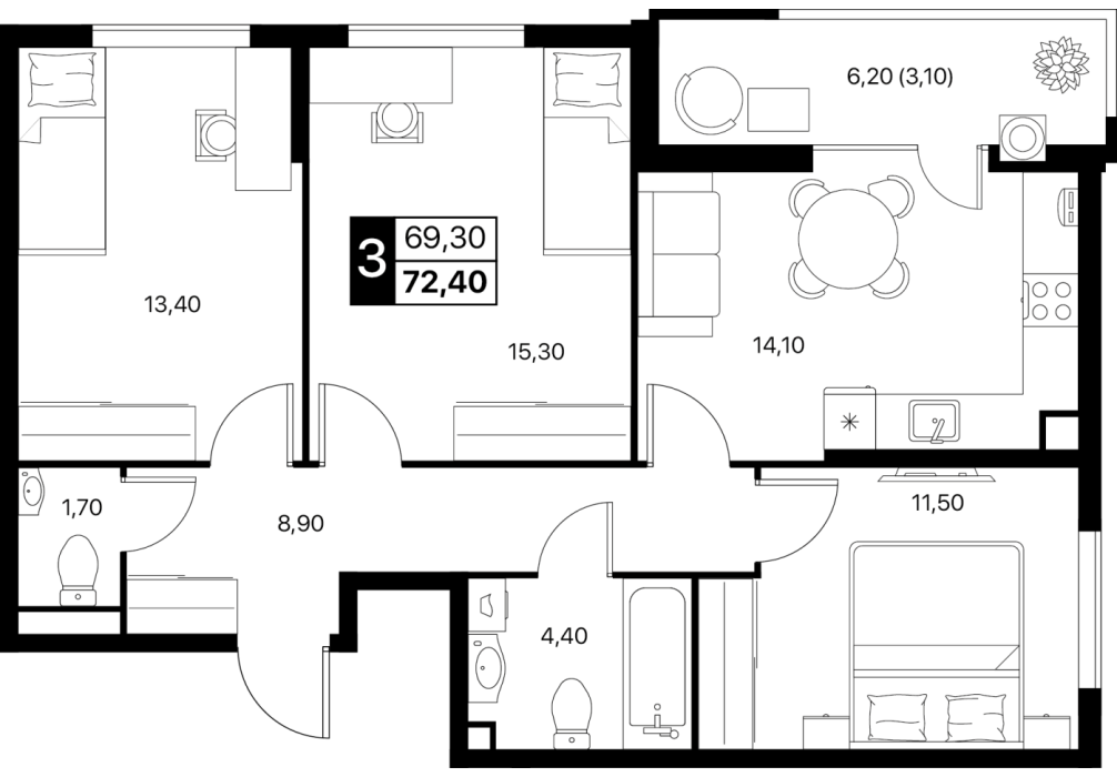В пакет входит кухня, тюль, корпусная и мягкая мебель, сплит-системы и вся необходимая бытовая техника