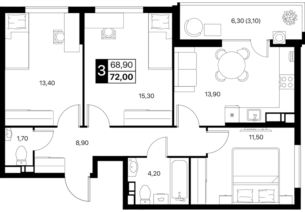 В пакет входит кухня, тюль, корпусная и мягкая мебель, сплит-системы и вся необходимая бытовая техника.