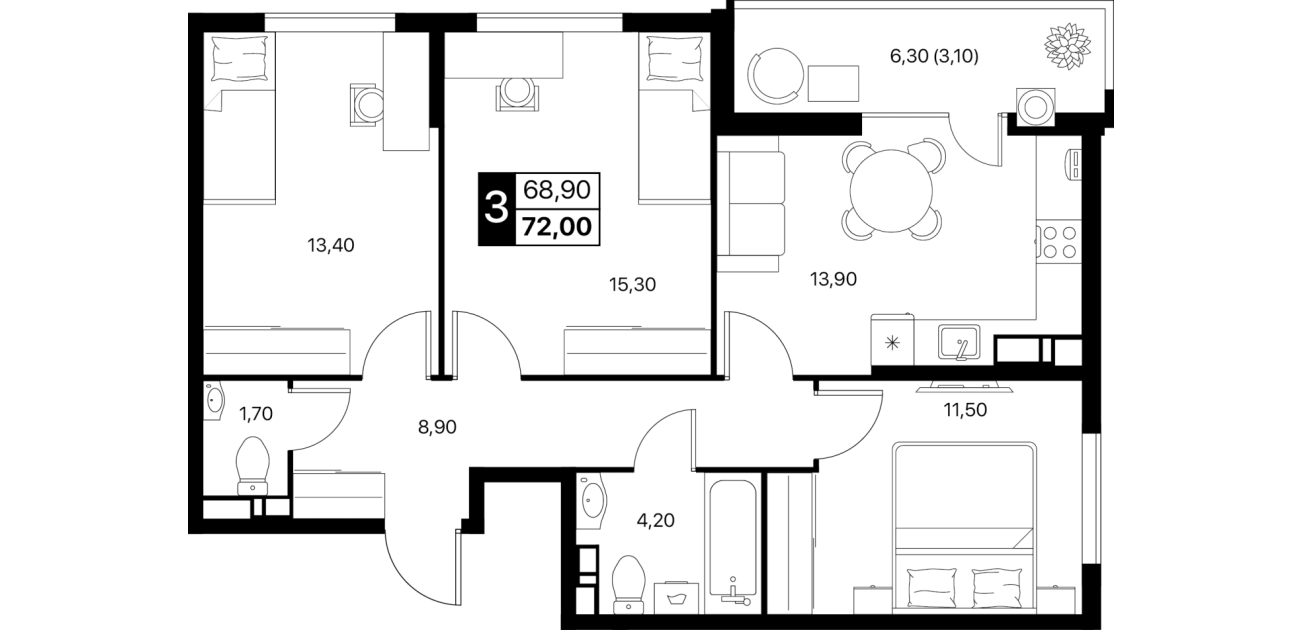 В пакет входит кухня, тюль, корпусная и мягкая мебель, сплит-системы и вся необходимая бытовая техника.