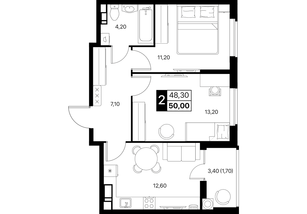 2-комнатная квартира: 49,3 м²