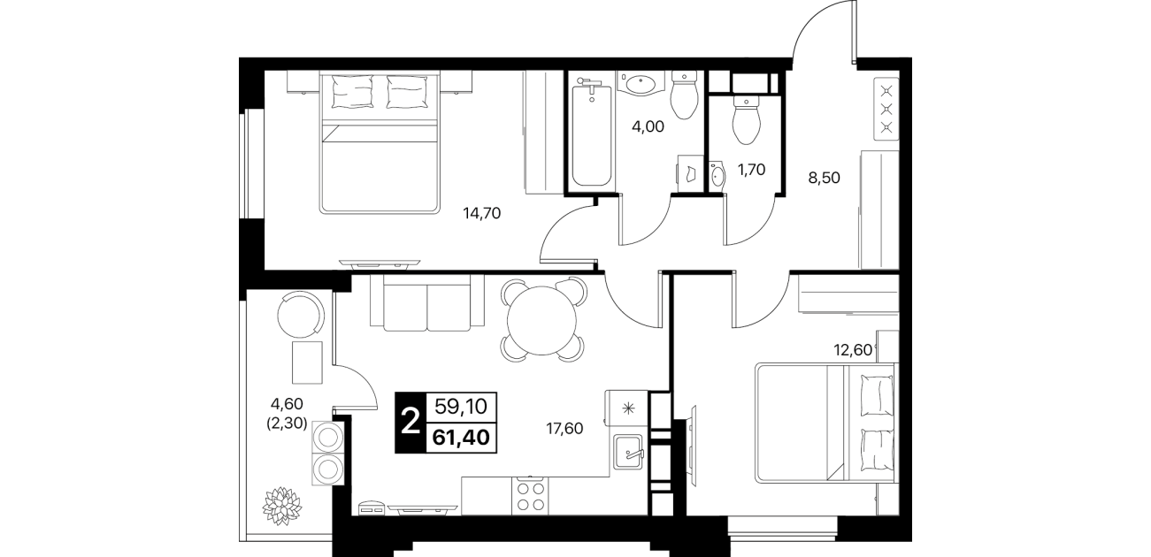 2-комнатная квартира: 61,4 м²