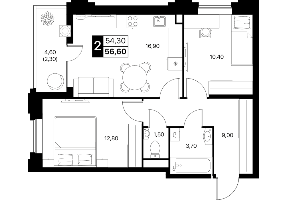 2-комнатная квартира: 61,4 м²
