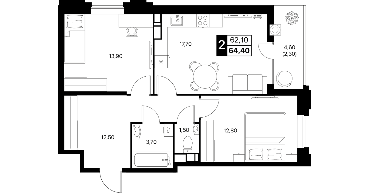 2-комнатная квартира: 64,4 м²