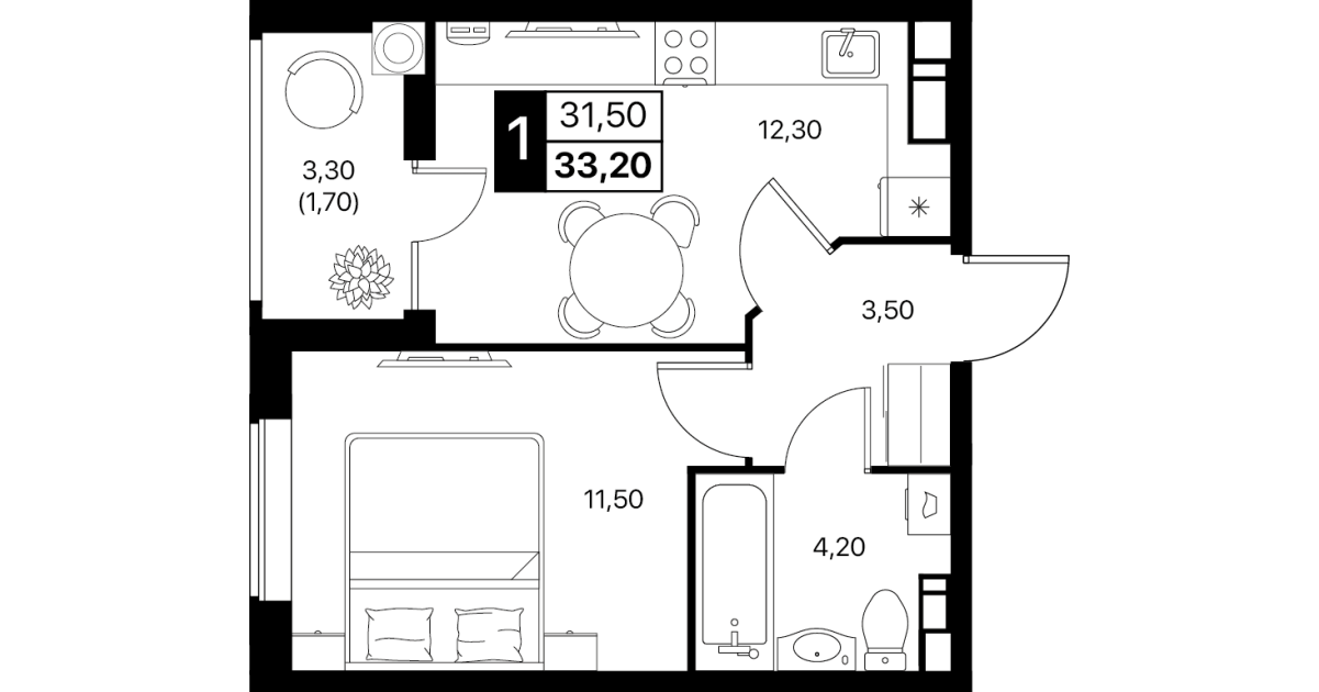 1-комнатная квартира: 33,2 м²